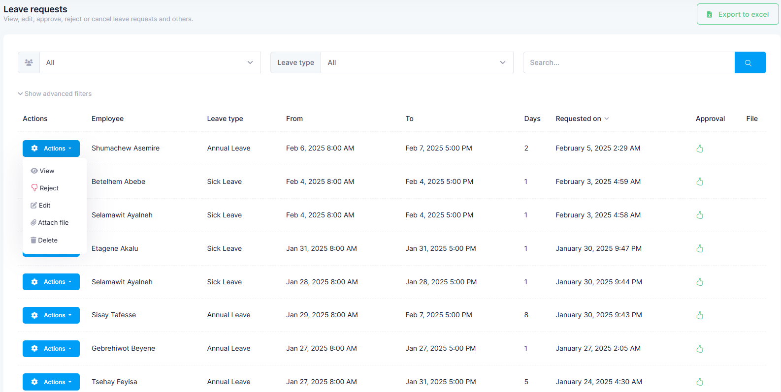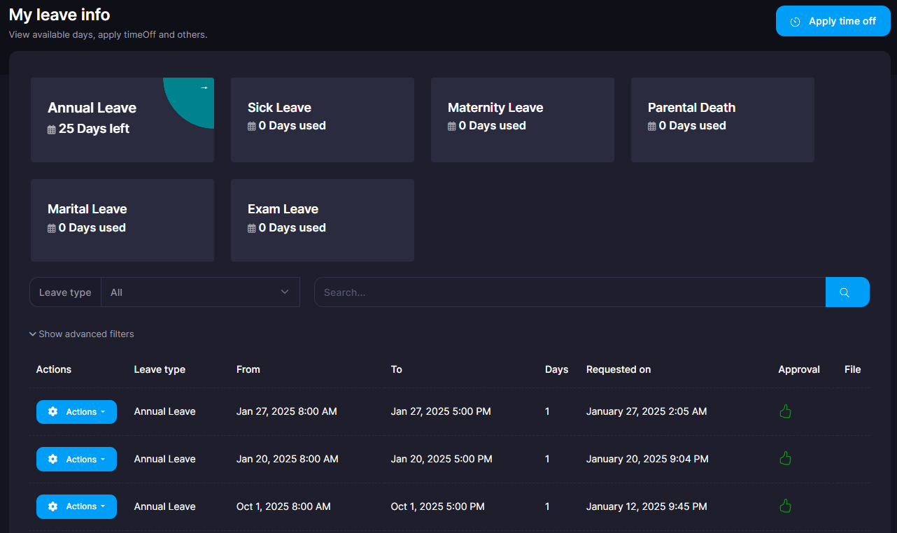 Employee management system that comprises full employee information such as joined date, leave management based on the country's HR policy. This system is also automated to automatically manage yearly annual day off days increment based on the service years served by the employee.