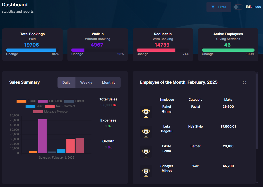 First things first, the system should be based on latest and robust framework. hence, i choosed .net core. Also, the system should implement role based authentication for each employee and also, added employee detailed information. Specialist has their own work schedules and for that, the system should be aware of that and implemented day off and sudden absents to be integrated with the booking. All the services given have their own cost and for this reason, evey service payment should be registered the amount with its respective receipt/Fiscal number. All this payments should be concieled with the report by the fiscal machine. The system also has to do the job of nominating 'Employee of the month' for the company to clearly show important employees highly contributing for the businees flow. Last but not least, Reporting! A system without report is not a system. hence, based on the LOB requriement of the company, i implemented a very robust reporting system that is flexible and all in one.