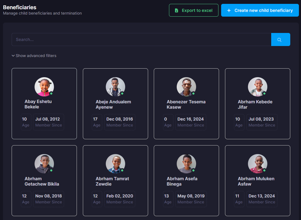 A centralized data system of children who are beneficiary in the organization. Every child progress records are put into the system which includes, Health, Education and trainings. Also, has the ability to record and track different Income generation activities by the children's family.